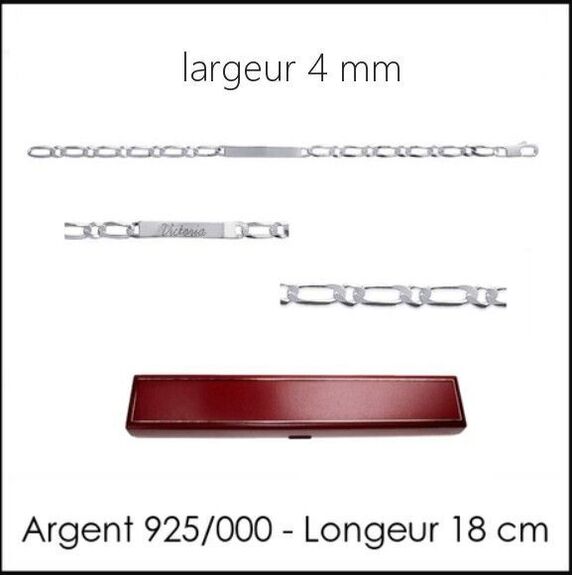 Bracelet gourmette mailles alternées gravure prénom, en argent poli brillant garanti 925/000. Poids : 4.10 grs. Longueur : 18 cm. largeur : 4 mm. Plaque à graver : 30 mm x 4.5 mm. Prix gravure joaillerie comprise recto verso, prénom, date,10 lettres maximum par face. ref : S6A004. Il vous suffit, de nous envoyer votre(vos) texte(s) via le formulaire ci-dessous. |
